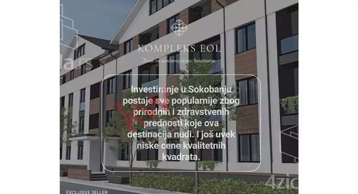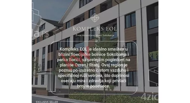 EOL kompleks je pravo mesto za Vas! Investitor na ovom projektu je biser Sokobanje - Hotel SUNCE, tako da je planiran kompleks premium kvaliteta sa dosta pratećeg sadržaja u vidu otvorenog bazena, mobilijara za decu, restorana, i preko 200 apartmana raznih kvadratura.