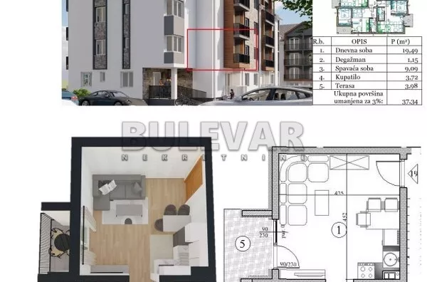 U ponudi novogradnja u Sokobanji, stanovi od 37-62m2. Na desetak minuta hoda od centra u blizini Sokotermi, pravi se novi kompleks, sada dve zgrade a zatim i apart hotel. Dve moderne zgrade sa stanovima kvadratura od 35 do 47m2 i par stanova većih kvadratura,grade se od visokokvakitetnih materijala sa zvučnom izolacijom, sigurnosna ulazna vrata , pvc stolarija sa aluminijumskim roletnama.. Svaki stan ima terasu i pripadajuće parking mesto koje je uračunato u cenu .Objekat će imati četri sprata, lift, intefon, pametan način ulaska u zgradu. Predivan pogled iz svakog stana na obližnje planine na 100m od obale reke.Stan od 37,34 m2 se nalazi na drugom spratu, lamela 1. Cena je sa Pdv-om uz mogućnost plaćanja na više rata po fazama gradnje, a za uplate celokupnog iznosa posebni popusti. Ovo je topla preporuka Bulevar grupe. Za sve informacije i razgledanje stojimo vam na raspolaganju, radnim danima od 09-19h i subotom od 09-17h. Ovu i druge nekretnine sa većim brojem fotografija možete pogledati na našem sajtu: bulevarnekretnine.rs, kontakt: [email protected], usluga besplatna. Čekamo Vas. Telefon 034... (prikaži broj telefona) i 060... (prikaži broj telefona) . Bulevar Nekretnine 034, Kragujevac, broj u registru posrednika: 1278.