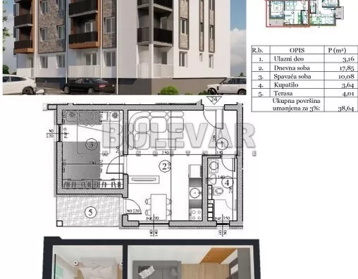 U ponudi novogradnja u Sokobanji, stanovi od 37-62m2. Na desetak minuta hoda od centra u blizini Sokotermi, pravi se novi kompleks, sada dve zgrade a zatim i apart hotel. Dve moderne zgrade sa stanovima kvadratura od 35 do 47m2 i par stanova većih kvadratura,grade se od visokokvakitetnih materijala sa zvučnom izolacijom, sigurnosna ulazna vrata , pvc stolarija sa aluminijumskim roletnama.. Svaki stan ima terasu i pripadajuće parking mesto koje je uračunato u cenu .Objekat će imati četri sprata, lift, intefon, pametan način ulaska u zgradu. Predivan pogled iz svakog stana na obližnje planine na 100m od obale reke. Stan od 38,64 m2 se nalazi na potkrovlju, lamela 1. Cena je sa Pdv-om uz mogućnost plaćanja na više rata po fazama gradnje, a za uplate celokupnog iznosa posebni popusti. Ovo je topla preporuka Bulevar grupe. Za sve informacije i razgledanje stojimo vam na raspolaganju, radnim danima od 09-19h i subotom od 09-17h. Ovu i druge nekretnine sa većim brojem fotografija možete pogledati na našem sajtu: bulevarnekretnine.rs, kontakt: [email protected], usluga besplatna. Čekamo Vas. Telefon 034... (prikaži broj telefona) i 060... (prikaži broj telefona) . Bulevar Nekretnine 034, Kragujevac, broj u registru posrednika: 1278.
