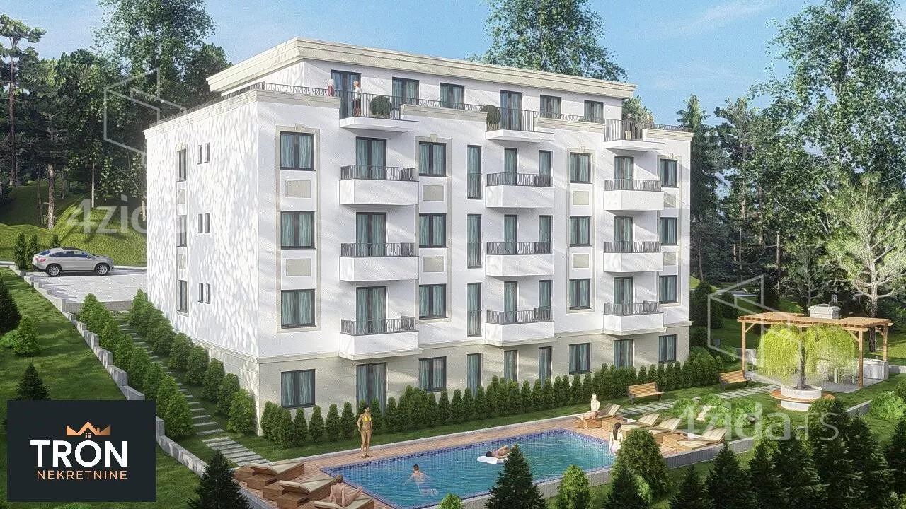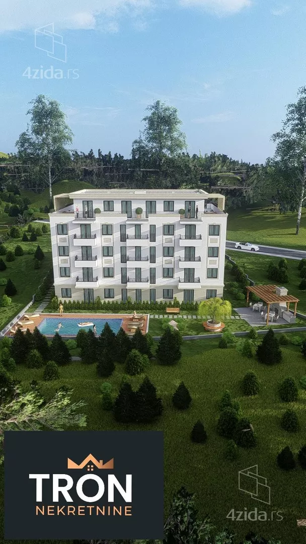 Ispred zgrade se nalazi bazen, što dodatno pruža ugođaj budućim kupcima.