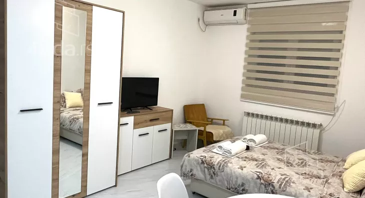 - Opremljenost: Namešteno - internet, TV, klima, kuhinjski elementi, frižider, šporet, ležaj, plakar, ugradni plakar