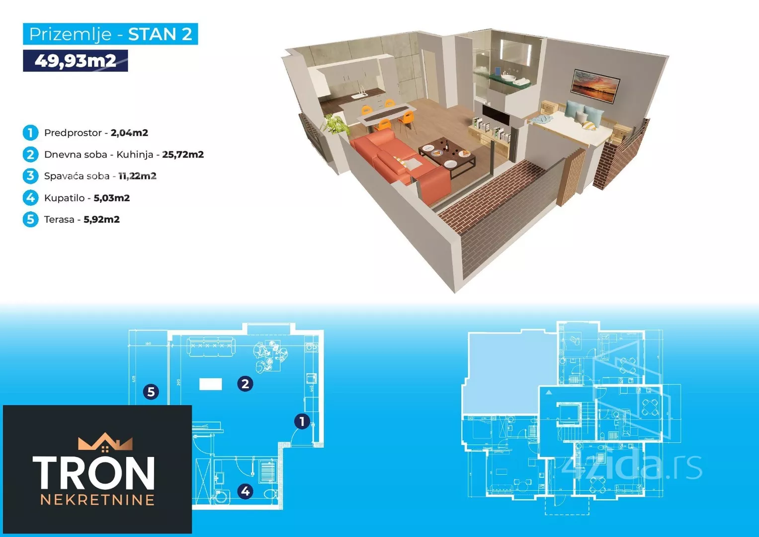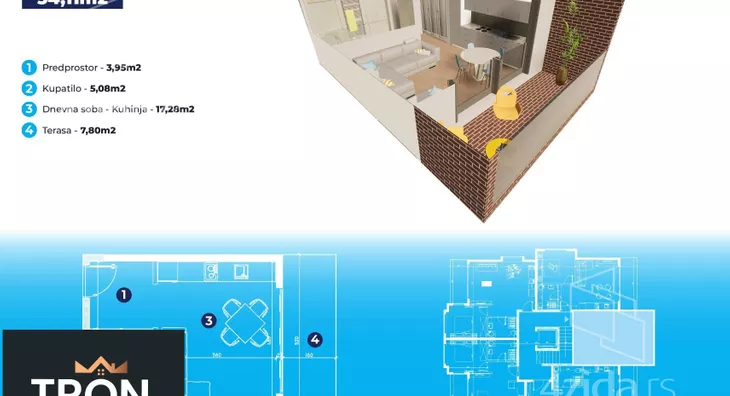 Izdvojićemo jednosoban stan površine 58,69m2 koji se nalazi na povučenom spratu.