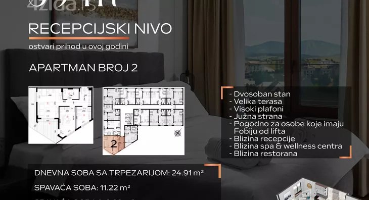 Kompletno lux opremljen dvosoban apartman (dnevna soba sa kuhinjom i trpezarijom, spavaća soba, spavaća soba II, kupatilo, terasa) u sklopu hotelskog kompleksa 21st Century Zlatibor Residence Spa & Wellness by Adora.