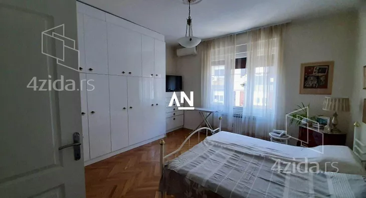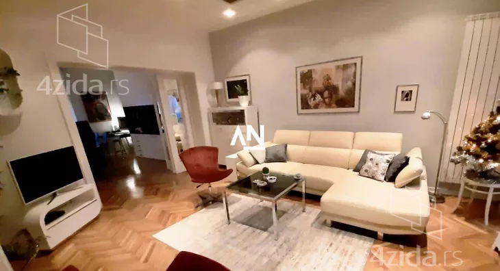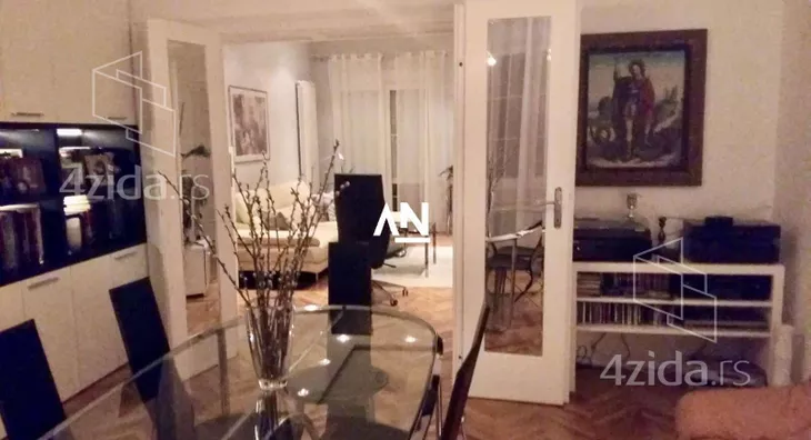 Prodaje se luksuzan, moderno sređen salonski stan sa dva ulaza, sam na trećem spratu sa liftom, u predratnoj četvorospratnoj zgradi sa ukrasnim kamenorezom na fasadi, u Molerovoj ulici. Odlično pozicioniran i tih, blizina Krunske i Kalenić pijace, a sto metara od Bulevara Kralja Aleksandra. Ukupna površina stana je 96m2 (86m2 knjižene grejne površine plus lođa i terasa). Kompletno je renoviran pre nekoliko godina uključujući sve instalacije, unutrašnja i ulazna vrata, prozore, keramiku. Hrastov parket je u odličnom stanju, a grejanje na klimu ili etažno. Visina plafona je 3m. Stan je dvostran, gleda na ulicu i na veliko, mirno dvorište sa zelenilom. Od prostorija ima: veće ulazno predsoblje sa dva plakara, dnevnu sobu, dve velike spavaće sobe, jednu manju (devojačku), kuhinju, kupatilo, gostinski toalet sa tušem, dugačku terasu, atraktivnu zastakljenu lođu (2m x 2m) i odvojenu prostoriju za veš mašinu i kotao. Poseduje i dve podrumske prostorije. Pogodnost je i mini market pored ulaza u zgradu. Stan za svaku preporuku. Vredi pogledati. Agencijska provizija 2%.