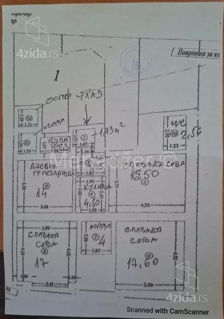 Od prostorija stan ima ulazni hodnik, srednjeno kupatilo, degazman, 3 spavace sobe, wc, kuhinju koja je povezana sankom sa dnevno-trpezarijskom delom, 3 ostave. Dvostrano je orijentisan. dve sobe gledaju na ulicu, a jedna je dvorisno orijentisana. U jednom delu stana su ugradnjeni spusteni plafoni. Spoljna stojarija je aluminjska, sobna vrata puno drvo.