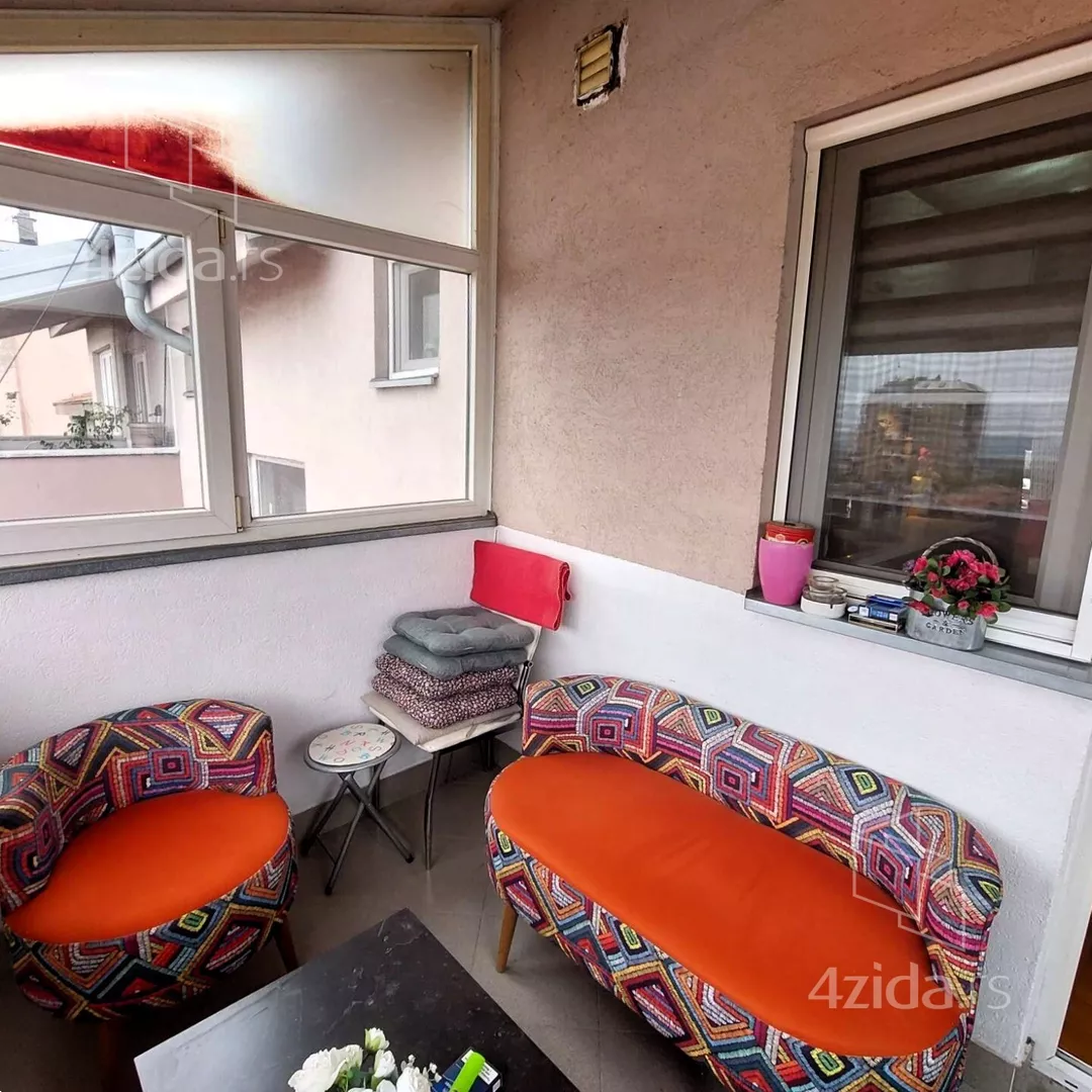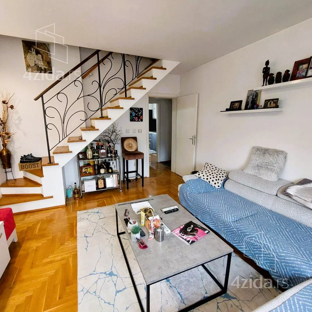 Karaburma, Marijane Gregoran, trosoban dupleks, uknjižen na 49m2, mereno sa dve terase i potkrovljem ukupno 75m2. Na petom je spratu od pet, dobro održavane zgrade sa interfonom. Na prvom nivou stana je hodnik, dnevna soba, spavaća soba, kuhinja sa trpezarijom, kupatilo i dve terase. Na drugom nivou je druga spavaća soba, garderober i prostirija od koje može da se napravi još jedno kupatilo. Stan je dvostrano orijentisan, svetao i sunčan, kompletno renoviran sa dobrom izolacijom. Grejanje je etažno na mermerne radijatore. Na idealnoj je lokaciji, u neposrednoj blizini škole, vrtića, marketa, doma zdravlja, autobuskog stajališta gradskog prevoza za druge delove grada.