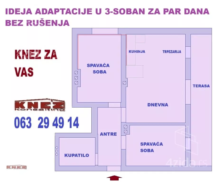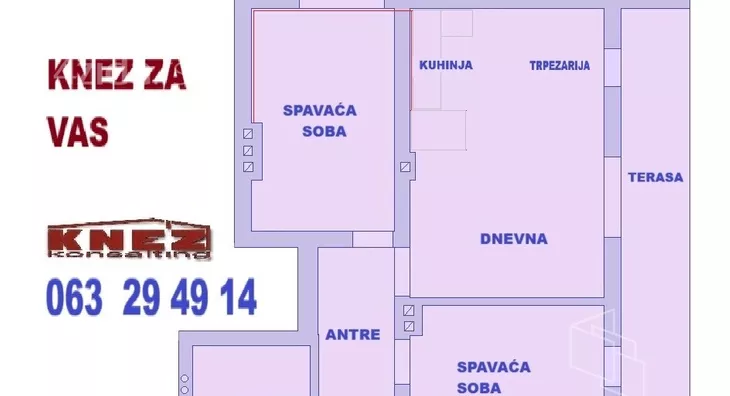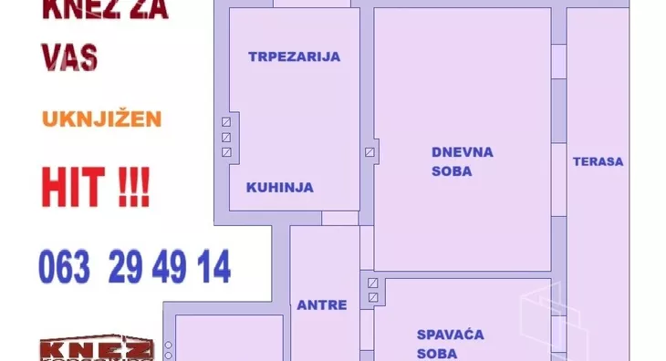 PROSTORIJE: HODNIK, KUHINJA SA TRPEZARIJOM, KUPATILO, 2 SOBE I TERASA.
