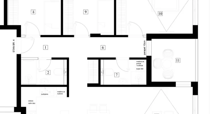 Stan sa pogledom ka dvorištu. Idealan raspored prostorija, sa tri spavaće sobe, kupatilom, velikom kuhinjom i terasom. Prostrana dnevna soba sa trpezarijom koja ima izlaz na terasu je centralni deo za okupljanje i uživanje sa porodicom i prijateljima. Prostorije pogoduju modernom načinu opremanja enterijera, uz odgovarajući prostor za garderobere. Stan se nalazi u središnjem delu zgrade, što mu daje dodatnu toplotnu izolaciju i niže troškove grejanja i hlađenja. Pored ovog stana na prvom spratu, u ponudi je i stan iste strukture na trećem spratu.