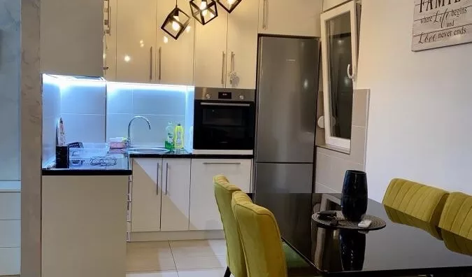 - Opremljenost: Namešteno - internet, interfon, TV, klima, veš mašina, sudo mašina, frižider, rerna, ležaj, plakar