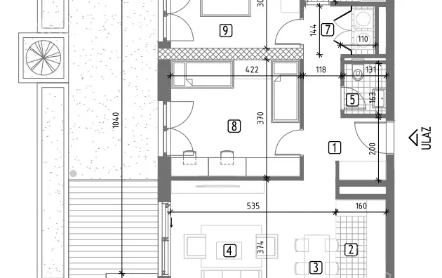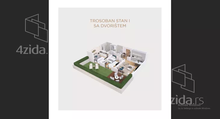 Stan se sastoji od velike dnevne sobe sa kuhinjom i trpezarijom, tri spavaće sobe, kupatila,toaleta i terase.