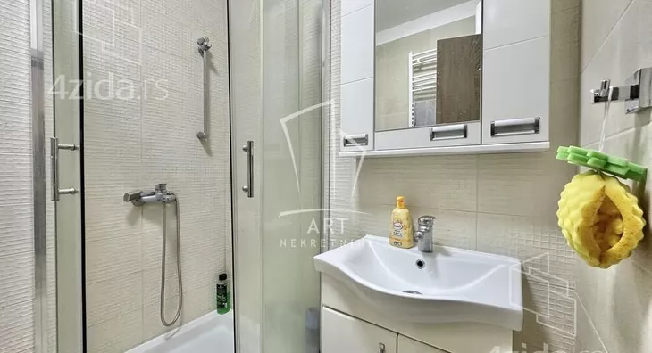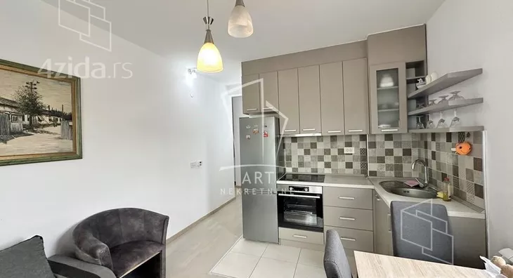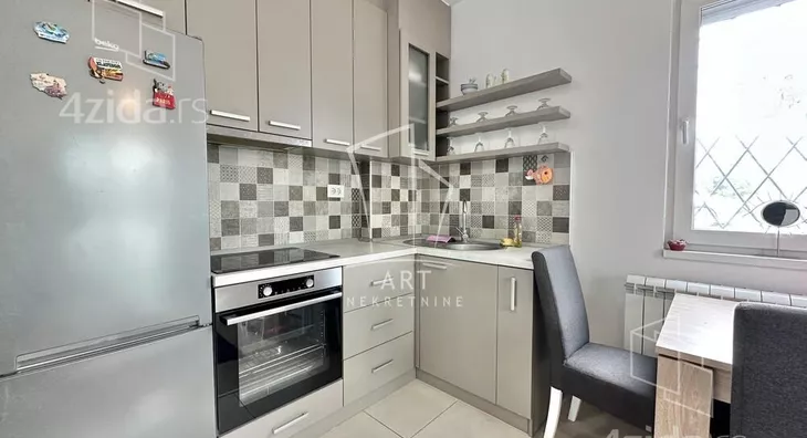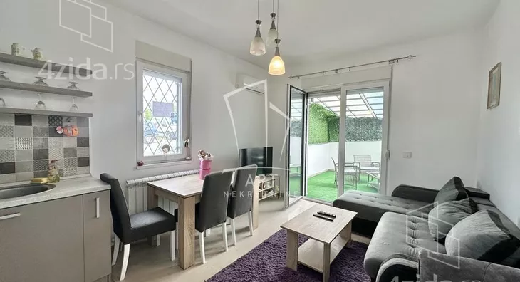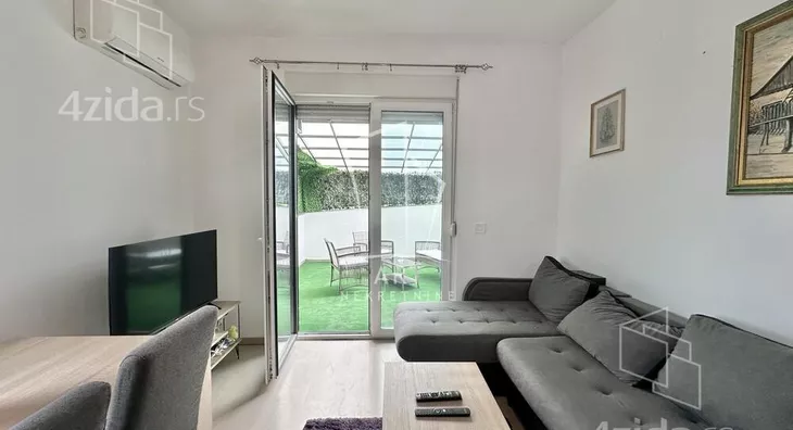 Stan se nalazi u prizemlju, u novoj zgradi i ukupne je površine 64 km2 , od čega 17 km2 pripada terasi. Sastoji se od dnevnog boravka sa kuhinjom i trpezarijom, spavaće sobe, toaleta i terase. Terasa je od poda do pola zazidana, a duga polovina kompletno zastakljena i obložena zelenom lisnatom ogradom. Pod terase je obložen pločicama, kompletno prekriven vodootpornim itisonom i opremljena je baštenskom garniturom. Stan se prodaje kompletno namešten. Uknjizen je 1/1 na vlasnika tako da je moguća kupovina na kredit . Agencijska provizija 2% Agent: Isidora Vukosavljević br. licence:6146 "Art nekretnine" d.o.o. Beograd Reg. br.339 011... (prikaži broj telefona) IV08 .