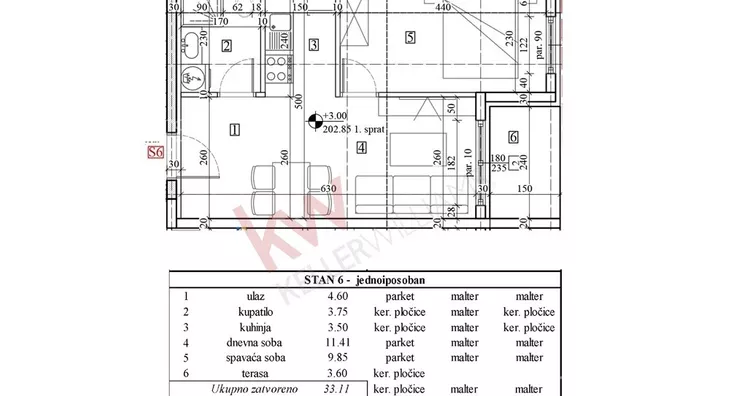 U ponudi je jednoiposoban stan koji se nalazi na visokom prizemlju. Sastoji se od ulaznog hodnika (4,60 m2), dnevne sobe sa trpezarijom (11,41 m2) kuhinje (3,50 m2), spavaće sobe (9,85 m2), kupatila (3,75 m2) i terase (3,60 m2).U gradnji se koriste najkvalitetniji materijali i oprema, PVC stolarija sa roletnama...
