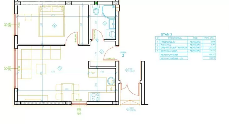 Na prodaju je stan u izgradnji površine 40m², savršen za moderan život ili kao investicija. Stan se nalazi u mirnom delu grada, sa svim potrebnim sadržajima u neposrednoj blizini.