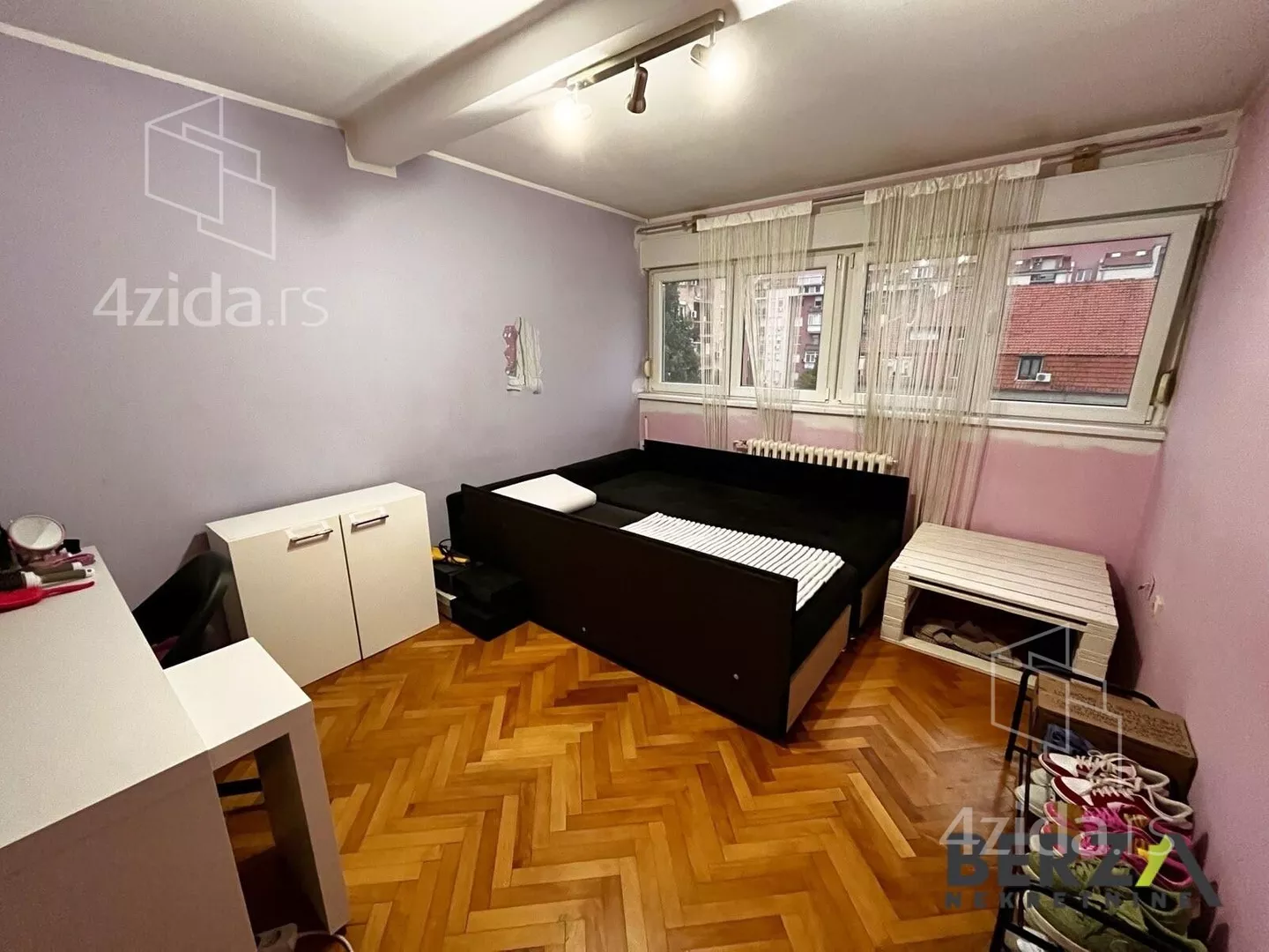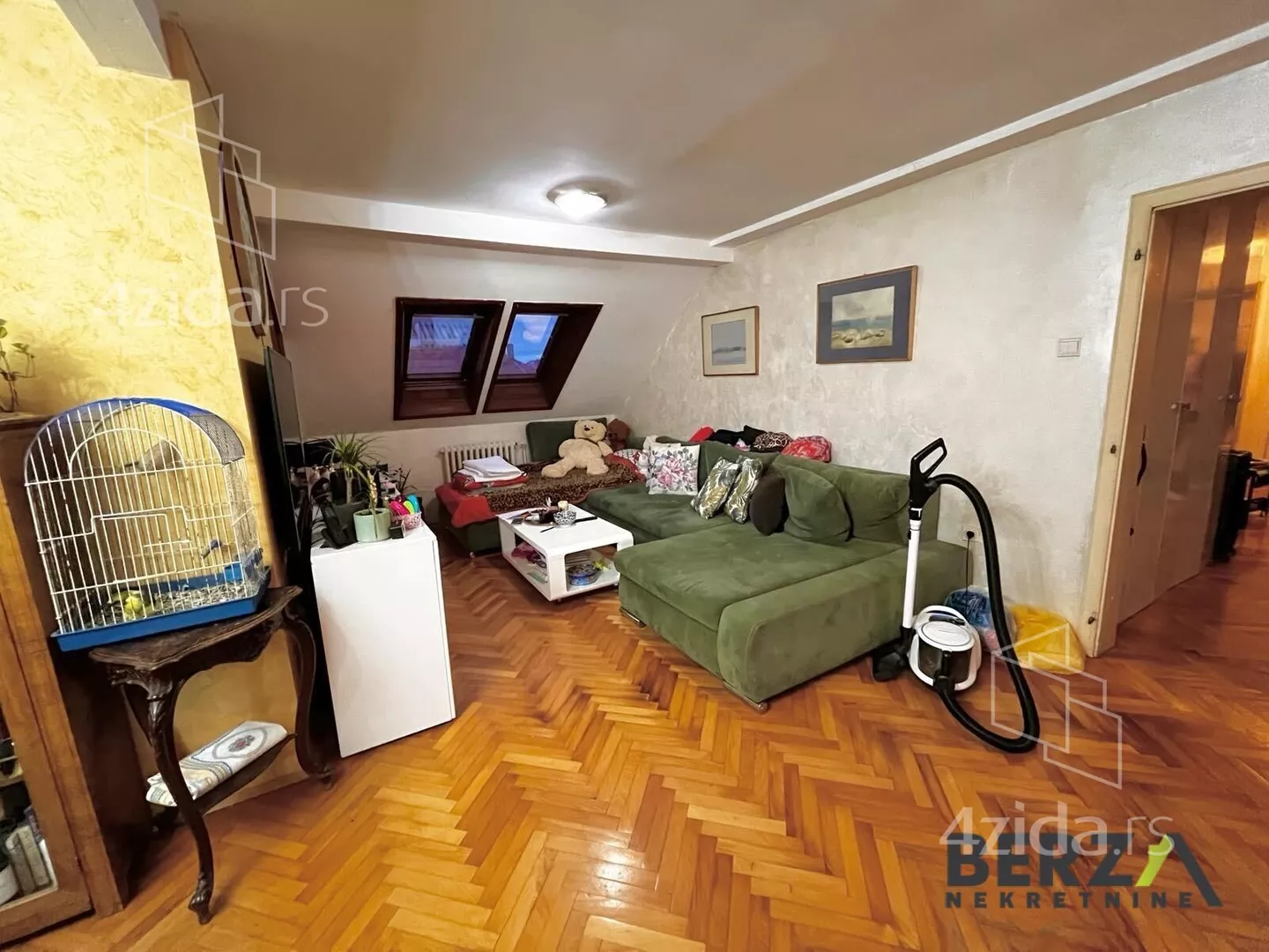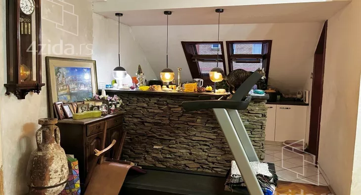 Sadrži dugačak hodnik koji vodi u ostale prostorije. Stan poseduje 3 spavaće sobe, prostran dnevni boravak sa trpezarijom, dok je kuhinja odvojena šankom. Takođe, stan raspolaže i sa špajzom i "ormar-sobom" kao posebnim prostorijama. U cenu ulazi i većina nameštaja koja se vidi na fotografijama, uključujući - opremeljenu kuhinju i kupatilo, plakare, krevete, trepazariju i slično.