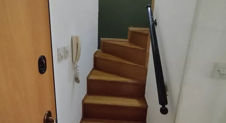 The lower part of the apartment includes a hallway, bathroom, living room with kitchen, and a terrace (and pantry).