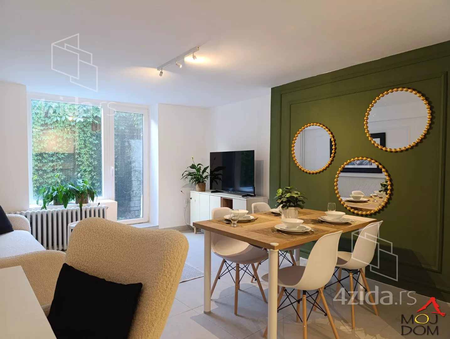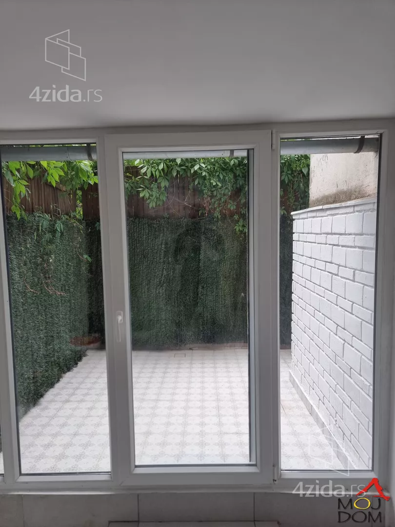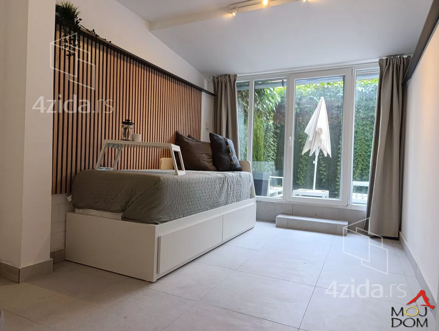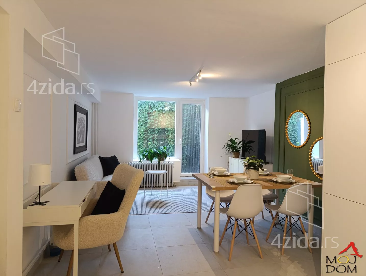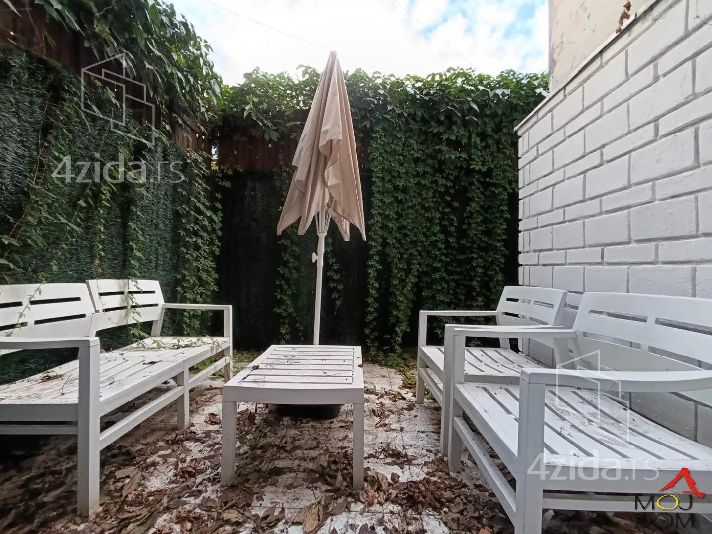 Stan odlikuju dve prostrane prostorije, obe sa izlazom na svoje privatno dvorištance sa zelenom ogradom, nova kuhinja po meri, kupatilo sa kompletno novom keramikom, sanitarijama i kanalizaciono-vodovodnom mrežom, novi električni provodnici i stilski nameštaj, koji u celosti ostaje kupcu.