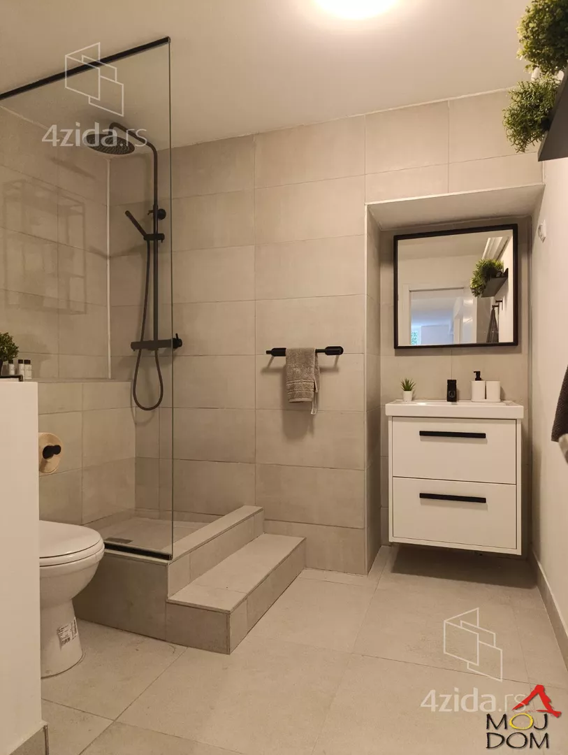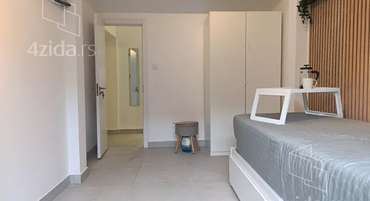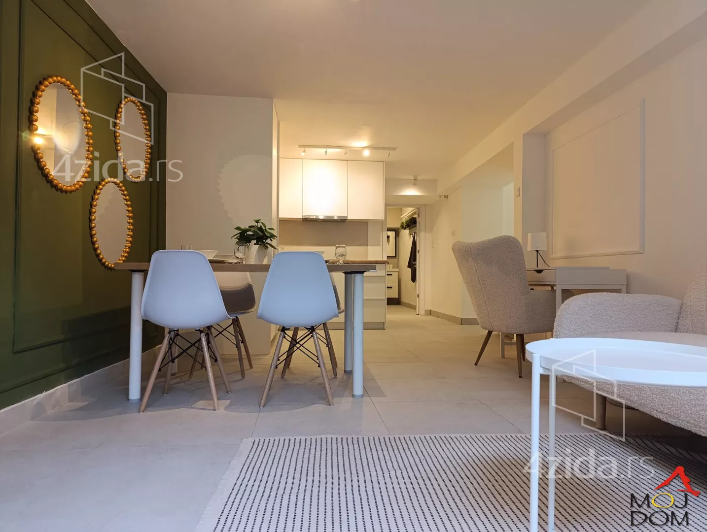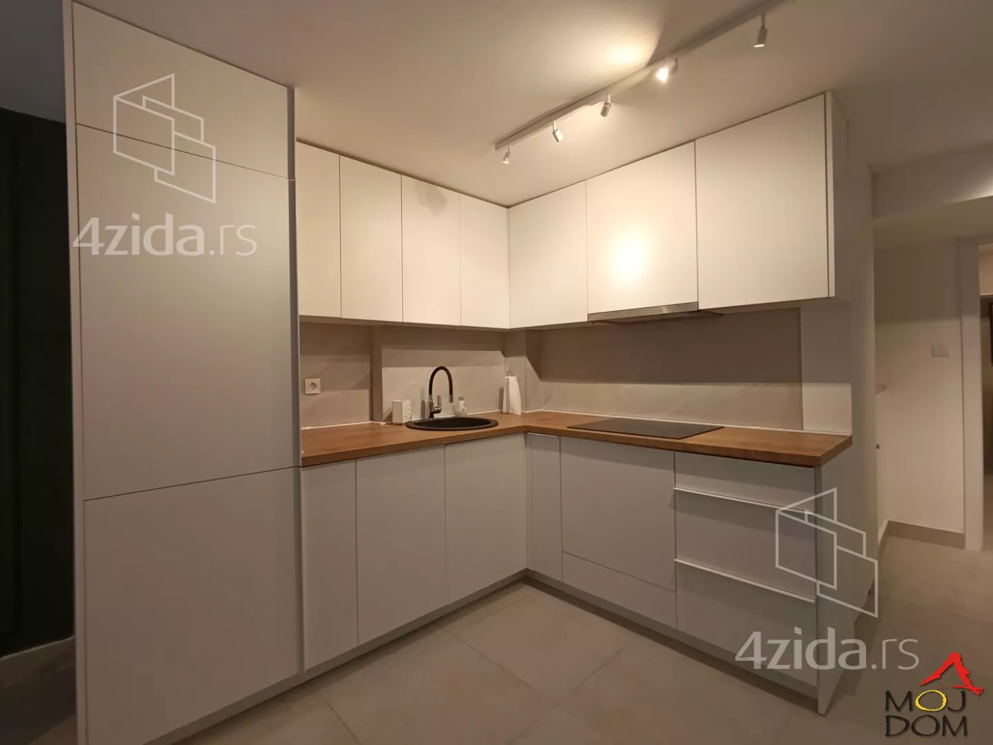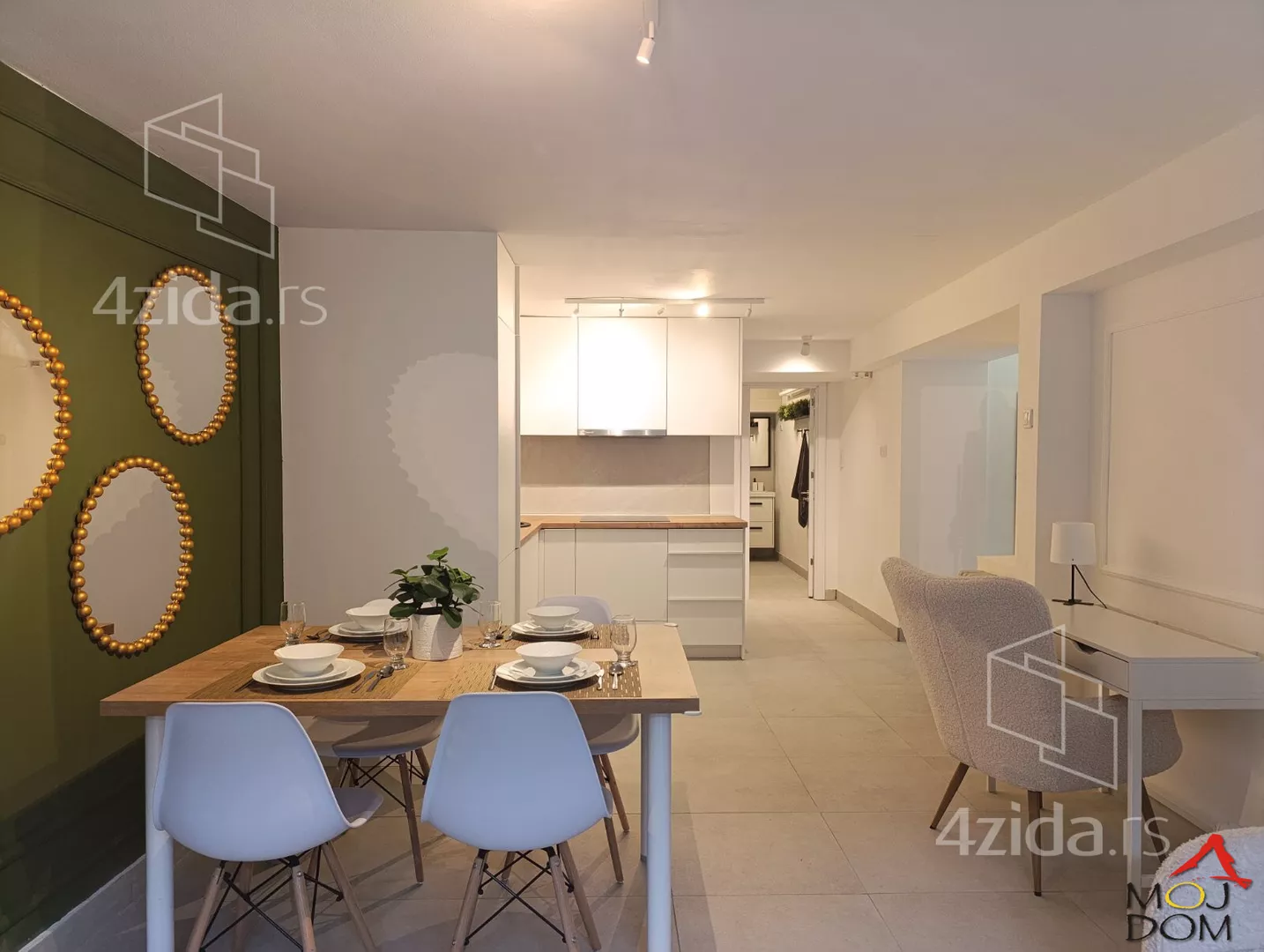 Stan odlikuju dve prostrane prostorije, obe sa izlazom na svoje privatno dvorištance sa zelenom ogradom, nova kuhinja po meri, kupatilo sa kompletno novom keramikom, sanitarijama i kanalizaciono-vodovodnom mrežom, novi električni provodnici i stilski nameštaj, koji u celosti ostaje kupcu.