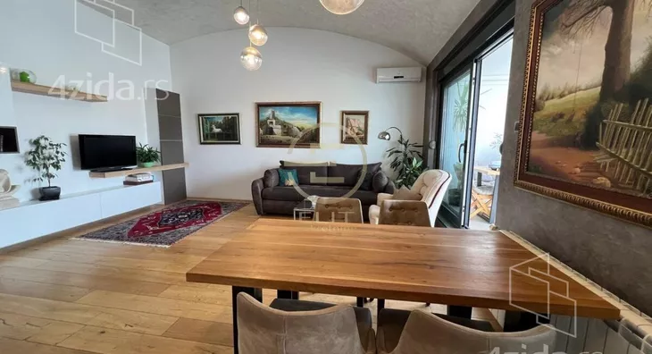 Prostoran dnevni boravak u otvorenom konceptu sa trpezarijom i kuhinjom rađenom po meri, izlaz na terasu od 20m2, master spavaća soba sa garderoberom i kupatilom sa tuš kabinom, hodnik, još jedna spavaća soba i zajedničko kupatilo sa kadom.