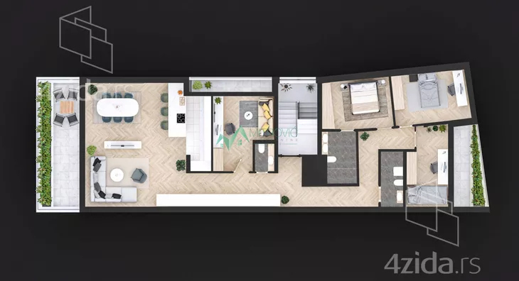 Ovaj luksuzan stan sa prostranim dnevnim boravkom, četiri udobne spavaće sobe, dva kupatila, toaletom i i lepom, velikom terasom sa izlazom iz dnevnog boravka, kao i drugom terasom sa izlaskom iz jedne od spavaćih soba, dok se na treću terasu izlazi iz takođe jedne od spavaćih soba.