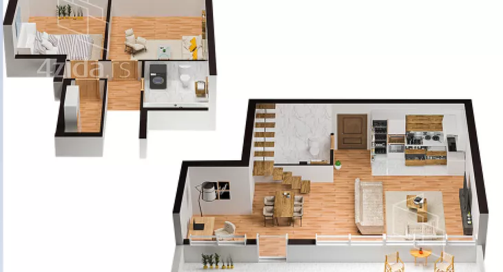 Dupleks od 75 m2 u ponudi je jako lepog rasporeda sa velikim dnevnim boravkom sa kuhinjom i trpezarijom, toaletom i prelepom terasom na donjoj etaži, a dve spavaće sobe, prostorom za garderober i kupatilom na gornjoj.