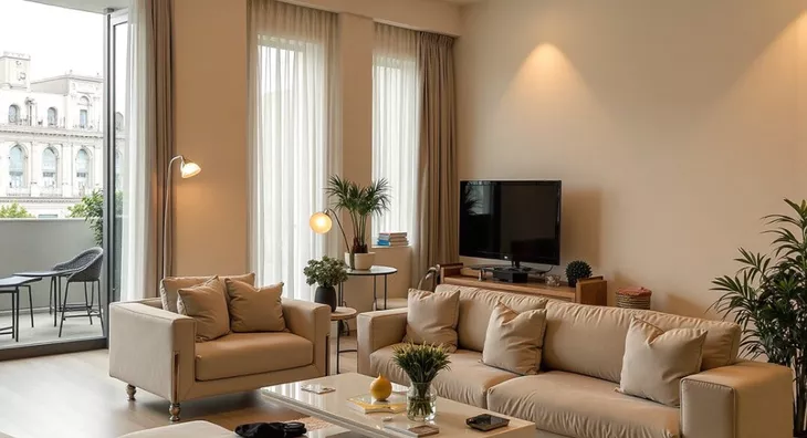 - В квартире 2,5 комнаты, прихожая, большая гостиная с кухней и столовой, две отдельные спальни, ванная комната и терраса.