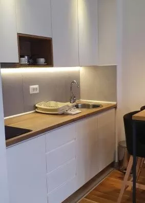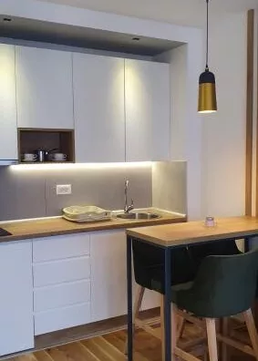 Nameštaj i oprema: Kompletno je uređen novim modernim nameštajem i opremljen el.uređajima(grejna ploča šporeta,napa,frižider,TV).Ne poseduje mašinu za veš ali postoji priključak u kupatilu.Poseduje i sitan iventar (posuđe,posteljinu i peškire).