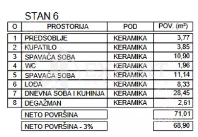 Na prodaju stan u novogradnji u blizini niške pivare, projektovane površine 71.01 m2. Stan je po strukturi dvoiposoban i sastoji se od ulaznog hodnika, dnevnog boravka sa trpezarijom i kuhinjom,dve spavaće sobe, kupatila, toaleta i terase. Stanu pripada i podrumska prostorija. Nalazi se u novogradnji SU+P+2 koju čine dve lamele, sa dva ulaza i dva lifta. Građena je skeletnim armirano-betonskim sistemom sa ispunom standardnim blokovima tako da zidovi nisu noseći, a krov je jednovodni, kos. Zidovi između stambenih jedinica su debljine 25 cm što obezbeđuje dobru zvučnu izolaciju. Spoljna fasada je Demit sa izolacijom 10 cm kamene vune. Spoljašnja stolarija je PVC u antracit boji sa termopan staklima i roletnama, dok je unutrašnja stolarija drvena. Na svim podovima predviđene su keramičke podloge. Grejanje je podno, na gas, predviđeno kao centralno. Parking mesta sun a parceli i dodatno se naplaćuju. Rok završetka je kraj 2027. Godine. Za kupce prvog stana postoji povrat PDV-a i moguća je kupovina putem stambenog kredita. Ovo je samo deo naše ponude, za vise informacija, stojimo vam na raspolaganju.