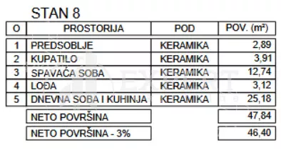 Na prodaju stan u novogradnji u blizini niške pivare, projektovane površine 47.84 m2. Stan je po strukturi jednoiposoban i sastoji se od ulaznog hodnika, dnevnog boravka sa trpezarijom i kuhinjom, spavaće sobe, kupatila i terase. Stanu pripada i podrumska prostorija. Nalazi se u novogradnji SU+P+2 koju čine dve lamele, sa dva ulaza i dva lifta. Građena je skeletnim armirano-betonskim sistemom sa ispunom standardnim blokovima tako da zidovi nisu noseći, a krov je jednovodni, kos. Zidovi između stambenih jedinica su debljine 25 cm što obezbeđuje dobru zvučnu izolaciju. Spoljna fasada je Demit sa izolacijom 10 cm kamene vune. Spoljašnja stolarija je PVC u antracit boji sa termopan staklima i roletnama, dok je unutrašnja stolarija drvena. Na svim podovima predviđene su keramičke podloge. Grejanje je podno, na gas, predviđeno kao centralno. Parking mesta sun a parceli i dodatno se naplaćuju. Rok završetka je kraj 2027. Godine. Za kupce prvog stana postoji povrat PDV-a i moguća je kupovina putem stambenog kredita. Ovo je samo deo naše ponude, za vise informacija, stojimo vam na raspolaganju.