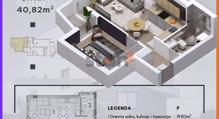 Stan koji gledate nalazi se na I spratu i sastoji se od ulaznog hodnika, dvevne sobe sa trpezarijom i kuhinjom, 1 spavaćom sobom, kupatilom i terasom. Stan je zapadno orijentisan. Ovakav stan je u ponudi i na II spratu.