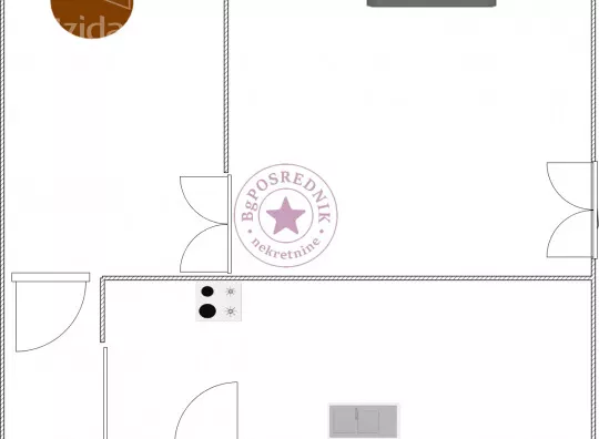 Prostorije: predsoblje, kuhinja, kupatilo, trpezarija, soba.