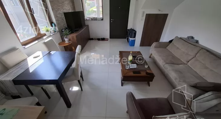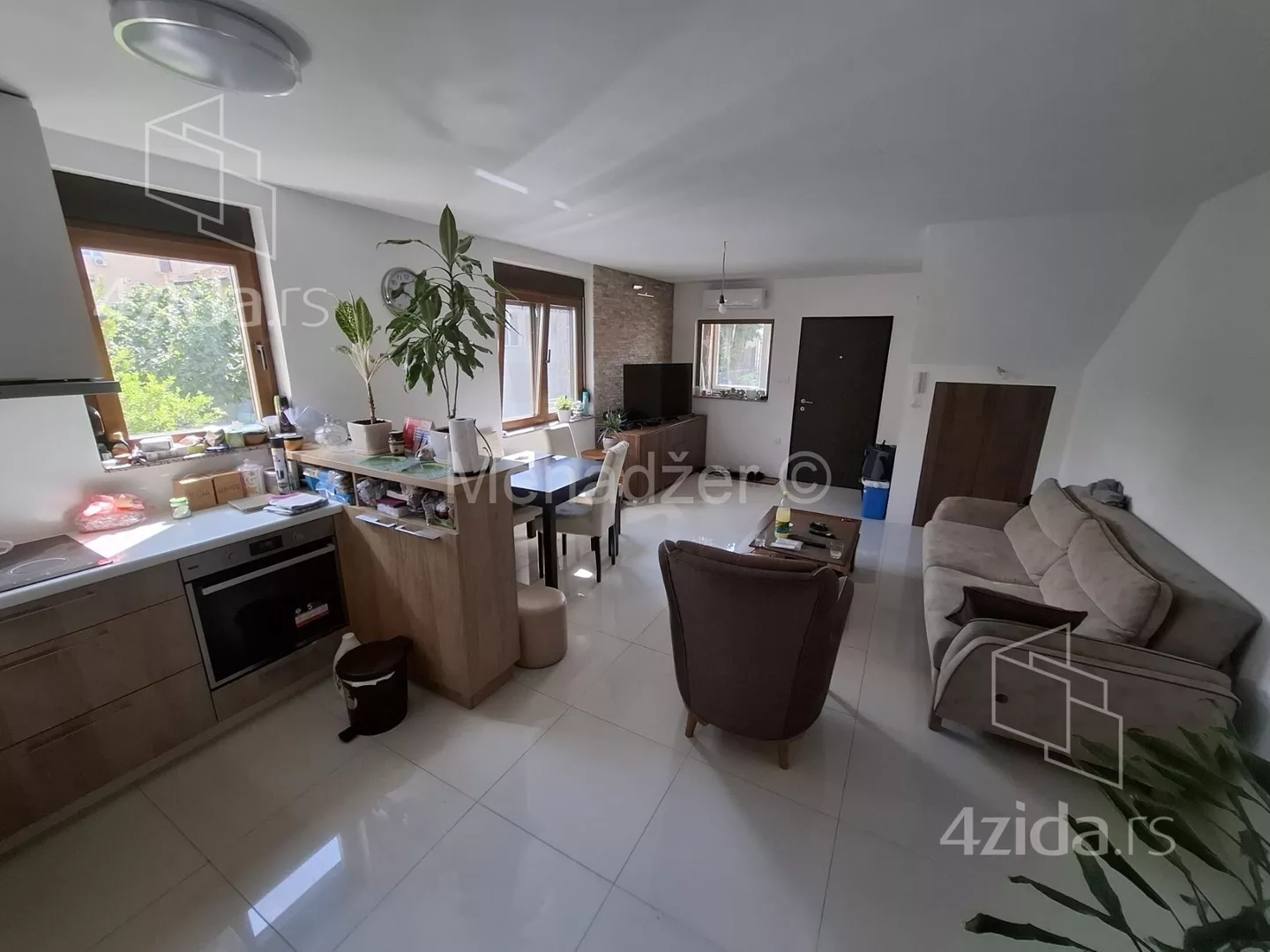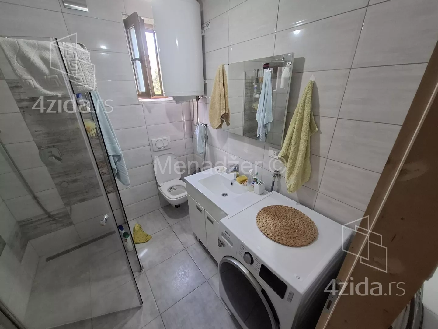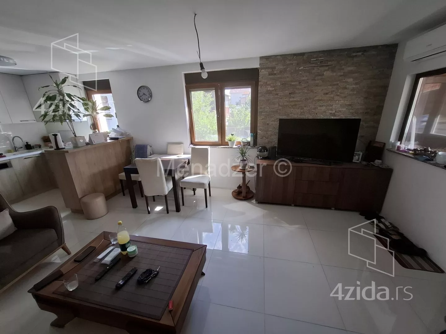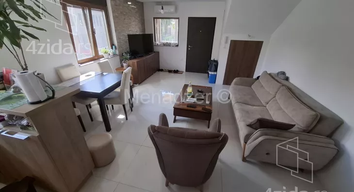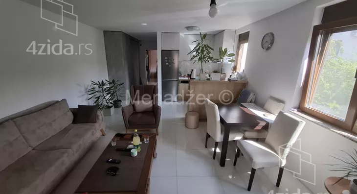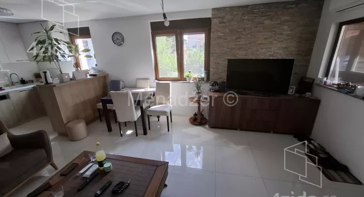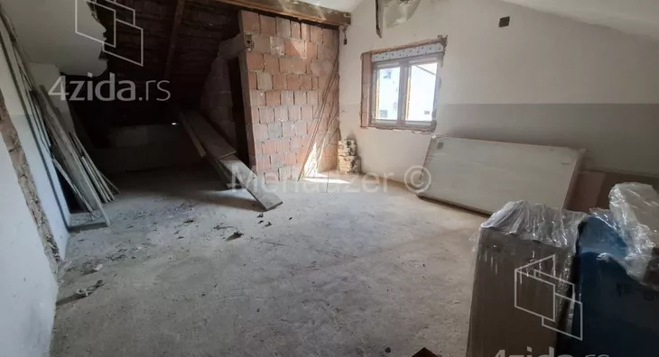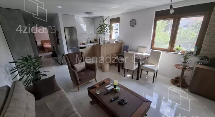 Garaza ima resenje o ozakonjenju. Stan je na prvom spratu i ima 48m2 i uknjizen je. Dvosoban po strukturi. Odvojenim stepenicama se ide na gornji nivo gde se nalazi tavnski prostor u grubim radovima gde je započet proces adaptacije u jednosoban stan. Stan na prvom spratu je nedavno lux komplet renoviran. Struja, voda, kupatilo, podovi, spoljna vrhunska stolarija alu-drvo, ugradna lux kuhinja koja ostaje u stanu. U stanu ostaju jos 2 ugradna americka plakara i kupatilski namestaj. Sve je novo. Stan od prostorija ima antre, odakle se ulazi u veliki dnevni boravak sa trpezarijom, kuhinjom, odvojenim sankom, radjenom po meri, degazman gde se nalazi veliki americki plakar, kupatilo i ulazak u spavacu sobu. Stan je osuncan, svetao i jako prijatan za boravak. Grejanje klima, i postoji prikljucak na gas.