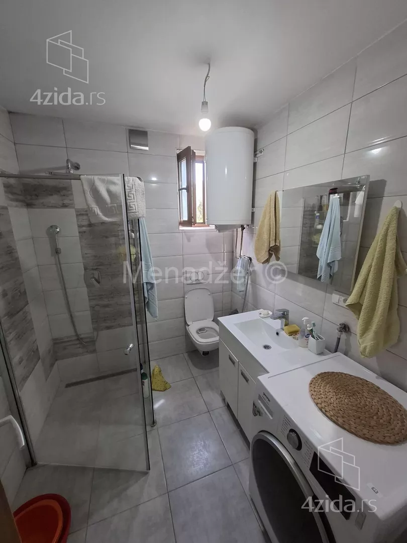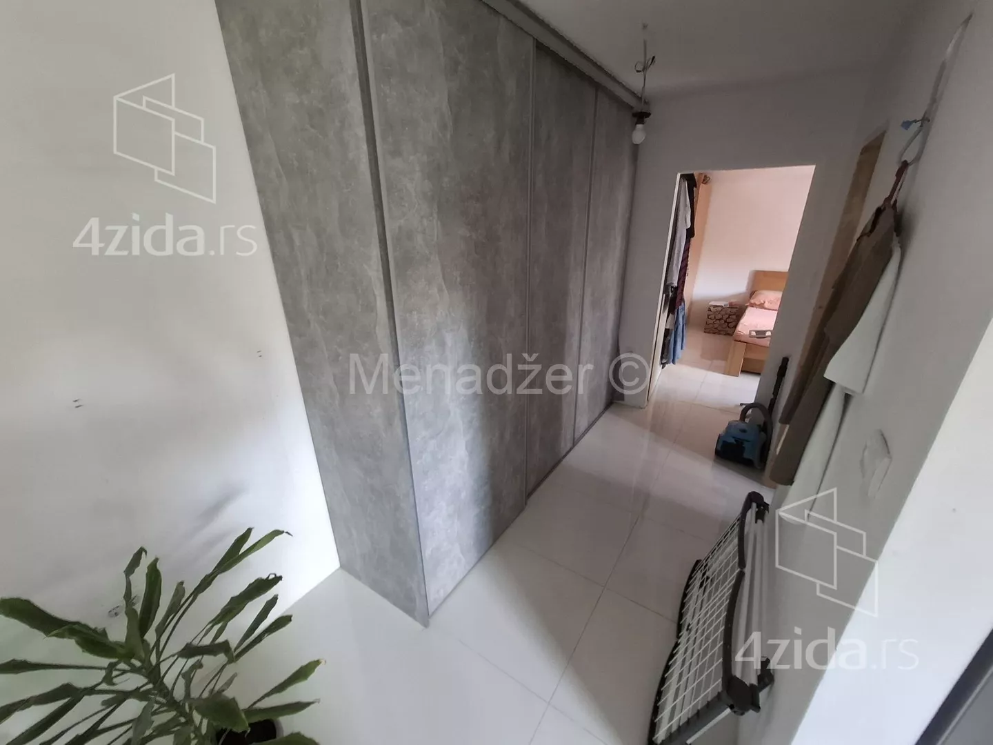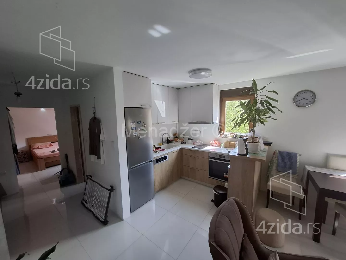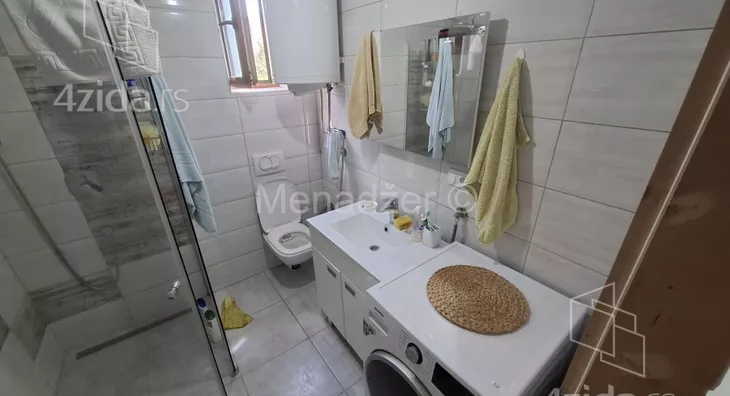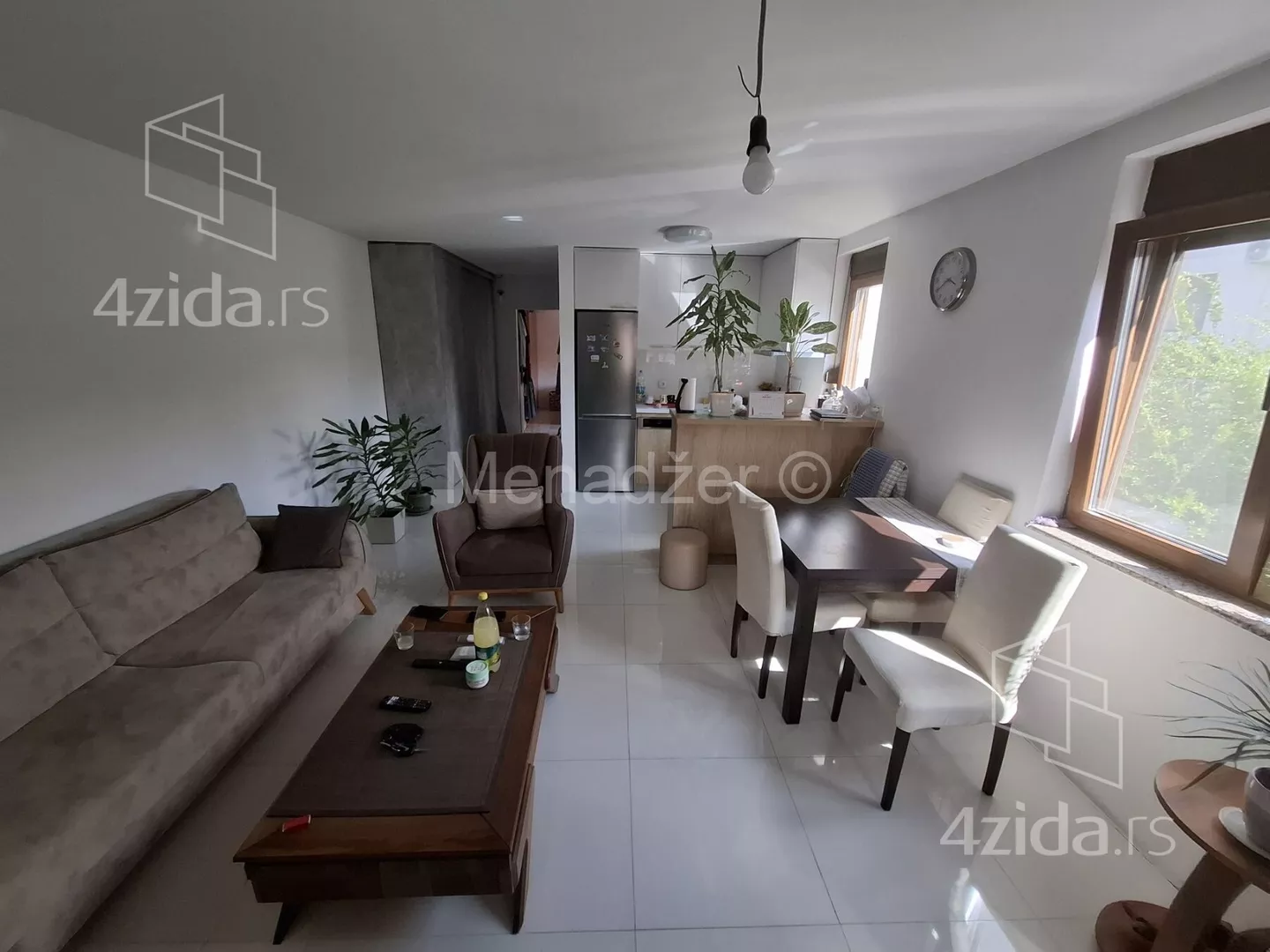 Garaza ima resenje o ozakonjenju. Stan je na prvom spratu i ima 48m2 i uknjizen je. Dvosoban po strukturi. Odvojenim stepenicama se ide na gornji nivo gde se nalazi tavnski prostor u grubim radovima gde je započet proces adaptacije u jednosoban stan. Stan na prvom spratu je nedavno lux komplet renoviran. Struja, voda, kupatilo, podovi, spoljna vrhunska stolarija alu-drvo, ugradna lux kuhinja koja ostaje u stanu. U stanu ostaju jos 2 ugradna americka plakara i kupatilski namestaj. Sve je novo. Stan od prostorija ima antre, odakle se ulazi u veliki dnevni boravak sa trpezarijom, kuhinjom, odvojenim sankom, radjenom po meri, degazman gde se nalazi veliki americki plakar, kupatilo i ulazak u spavacu sobu. Stan je osuncan, svetao i jako prijatan za boravak. Grejanje klima, i postoji prikljucak na gas.