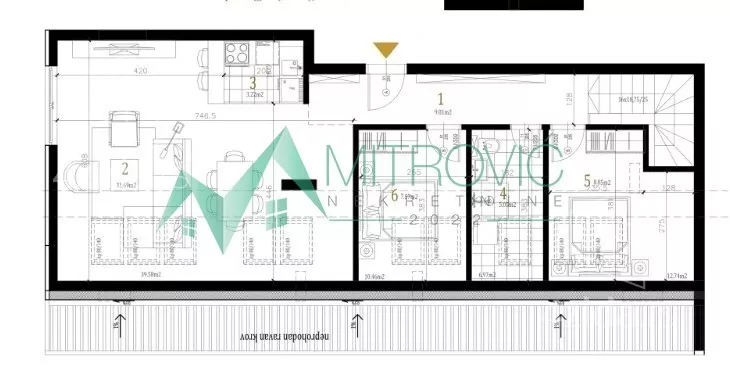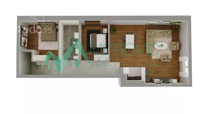 Čine ga prostorije sledećeg rasporeda: dnevni boravak sa trpezarijskim delom i kuhinjom, dve spavaće sobe i kupatilo.