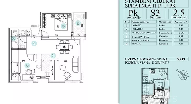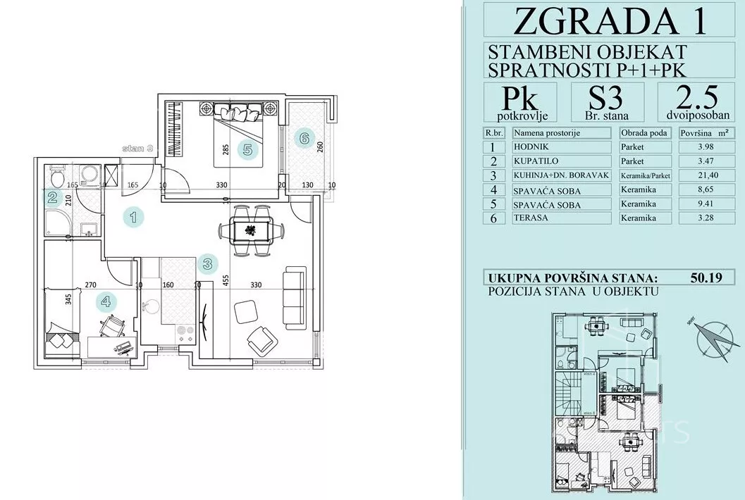 Dvoiposoban stan u zgradi za prodaju, Petrovaradin, 50 m2, na 2. spratu. Stanje - U izgradnji, ima terasu.