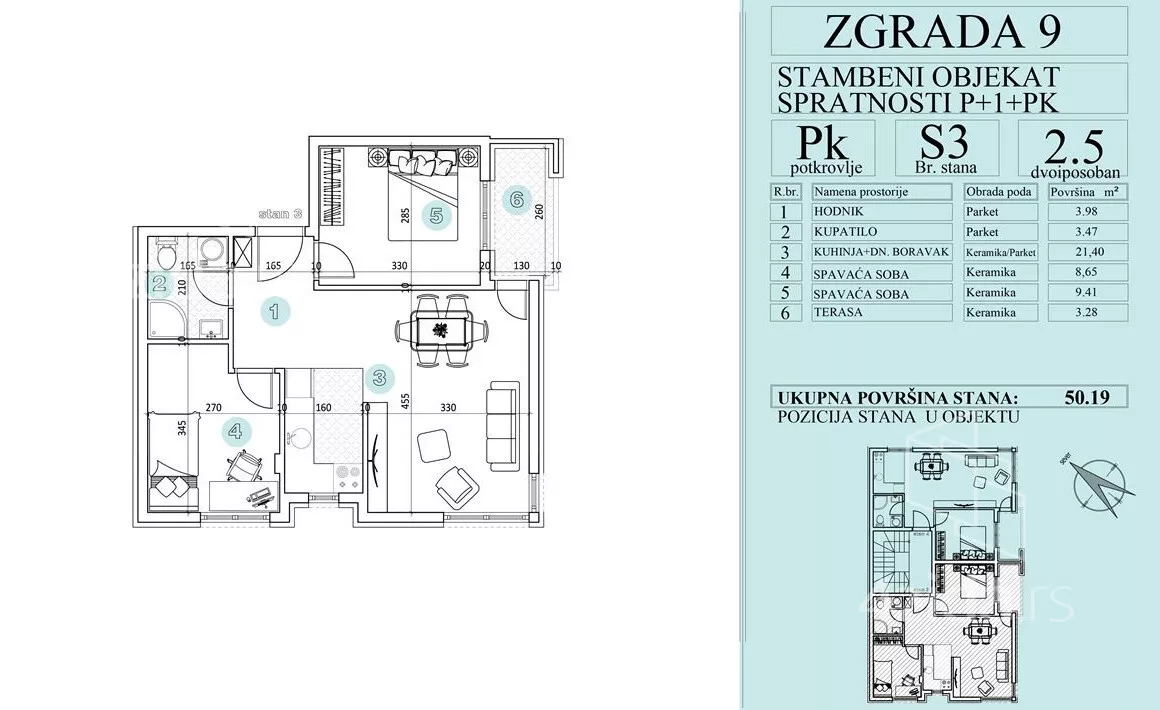 Dvoiposoban stan u zgradi za prodaju, Petrovaradin, 50 m2, na 2. spratu. Stanje - U izgradnji, ima terasu.