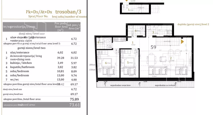 U donjem delu je samo ulazni hodnik i stepenište, a na gornjem delu u potkrovlju dnevni boravak sa trpezarijom, kuhinja, kupatilo, dve sobe, wc i hodnik.