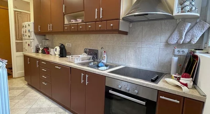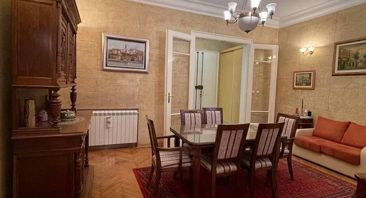 Stan površine 113 m² uknjiženo (realno 129 m² + 2 terase od 8 m²) odlikuje se visinom plafona od 3,2 m i autentičnim salonskim rasporedom. Sastoji se od: ulaznog hodnika sa garderoberom, prijemnog salona, prostranog dnevnog boravka, dve spavaće sobe sa izlazom na terase, odvojene kuhinje, ostave i kupatila.Stan je delimično renoviran – zamenjena je spoljna stolarija (šestokomorni prozori sa elektro podizačima roletni), kompletna kuhinja sa ugradnom tehnikom koja ostaje u stanu, a dodatno je ugrađen električni kotao koji može da se koristi uz centralno grejanje.Dvostrano orijentisan i veoma osvetljen, stan predstavlja odličnu priliku za porodični život ili investiciju za izdavanje. Budući vlasnik ima mogućnost zakupa parking mesta odmah pored zgrade.