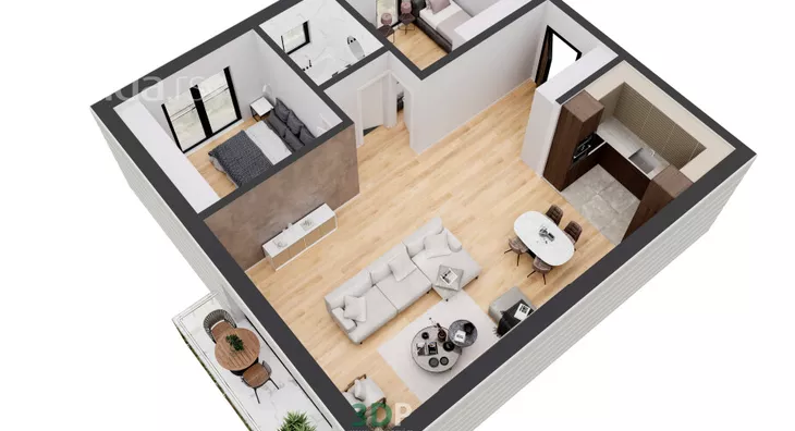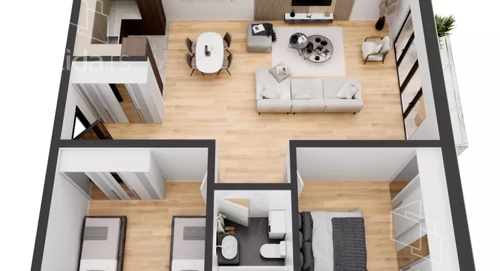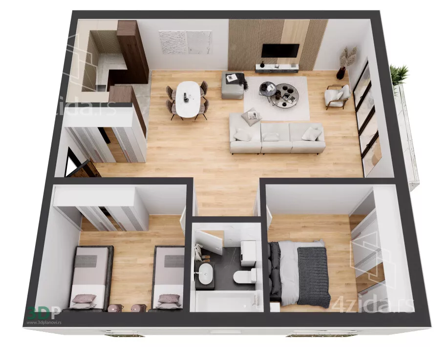 Stan poseduje predsoblje, hodnik, dnevnu sobu sa kuhinjom i trpezarijom, dve spavaće sobe od kojih je jedna master, jedno kupatilo i jedan toalet.