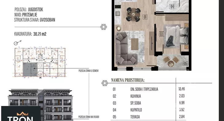 Izdvajamo jednosoban stan površine-36,21m2.
