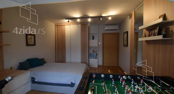 - Opremljenost: Namešteno - internet, interfon, TV, klima, veš mašina, sudo mašina, frižider, rerna, ležaj, plakar
