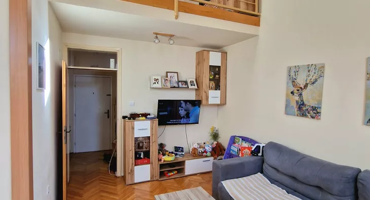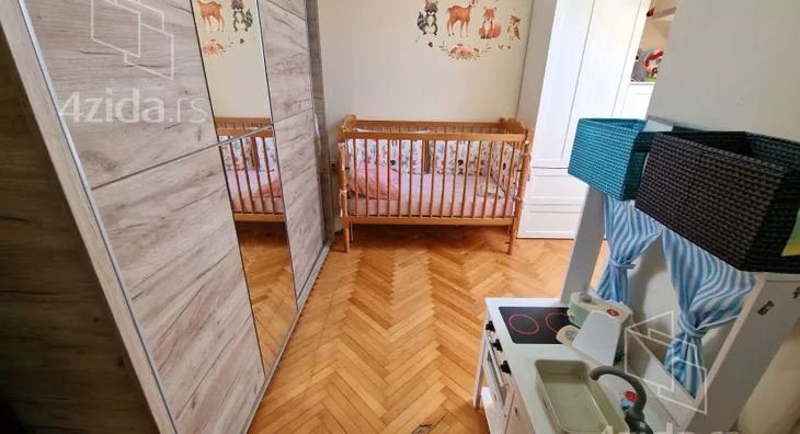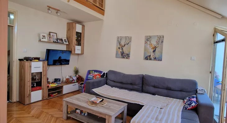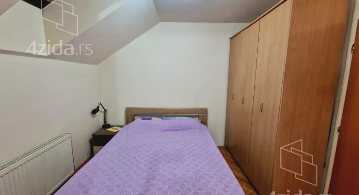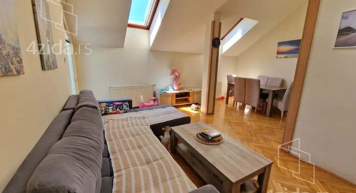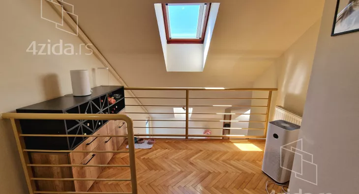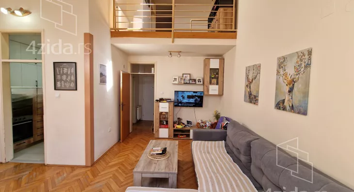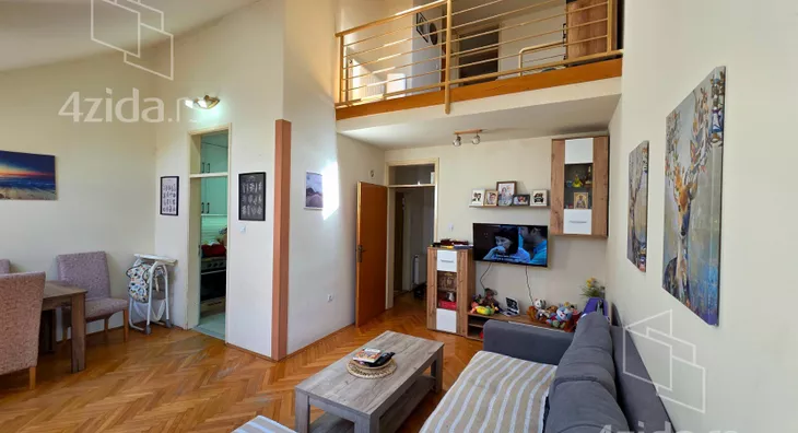Na prodaju trosoban stan-duplex na četvrtom spratu bez lifta u kvalitetnoj zgradi u naselju Sarina Međa u blizini Akva parka,stadiona,izletišta Potok,ZOO vrta i ostalih sadržaja.Stan se sastoji iz dva nivoa.U donjem se nalazi ulazni hodnik,kupatilo,dnevni boravak sa trpezarijom i izlazom na terasu i izdvojena kuhinja.Iz ulaznog hodnika stepenicama se ide na gornji nivo koji ima galeriju i tri spavaće sobe.Kosine su betonske i pokrivene crepom.Stan poseduje pripadajući podrum i ima slobodan parking za stanare iza zgrade.Na podovima je hrastov parket.Kima 24" i kompletna kuhinja(bez frižidera)ostaju u ceni stana.Moguća je kupovina i putem stambenog kredita.Uknjižen 1/1 Stan nije klasičan,veoma je svetao,južno orjentisan i sa otvorenim pogledom ka Akva parku u daljini.Praktičan za mlađe parove i porodice koje vole ovaj tip stana.U neposrednoj blizini je veliki Roda market i vrtić.