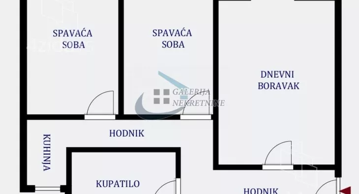 Od prostorija: hodnik, dnevna soba, dve spavaće sobe, kuhinja i kupatilo.