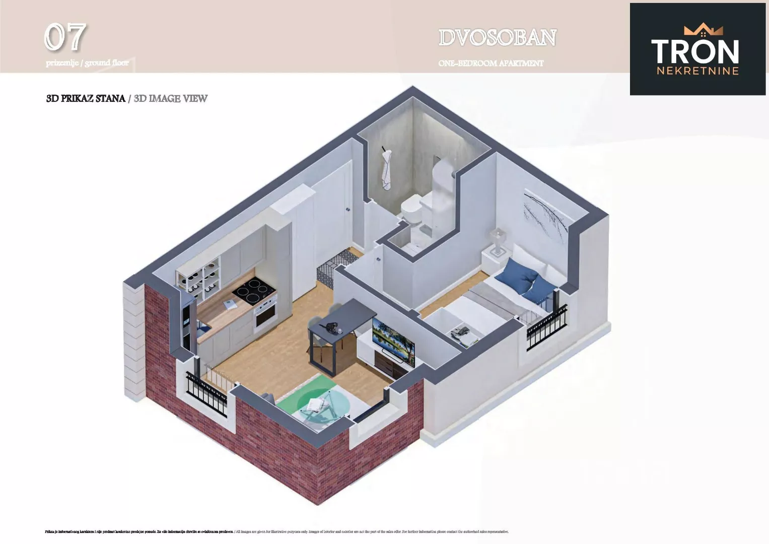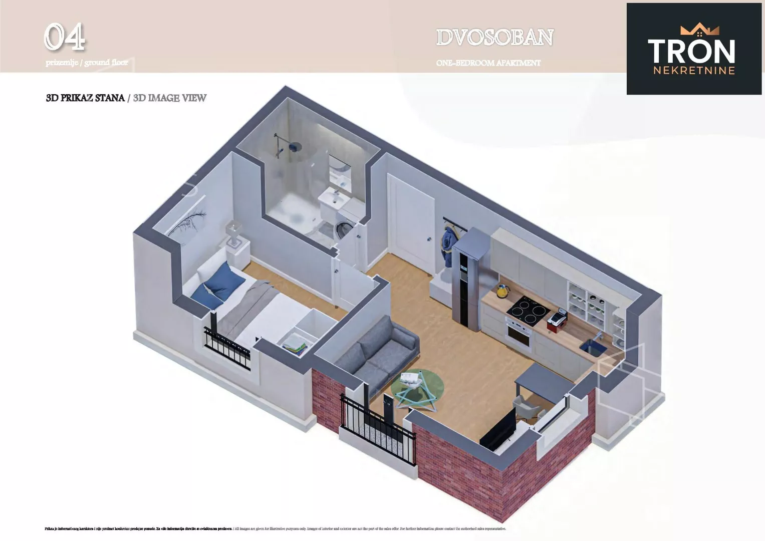 Stan se sastoji iz: dnevne sobe sa kuhinjom i trpezarijom, spavace sobe, kupatila, hodnika i terase.