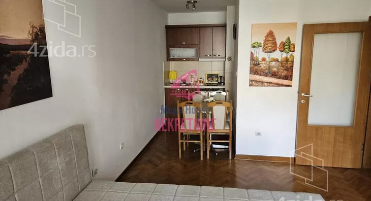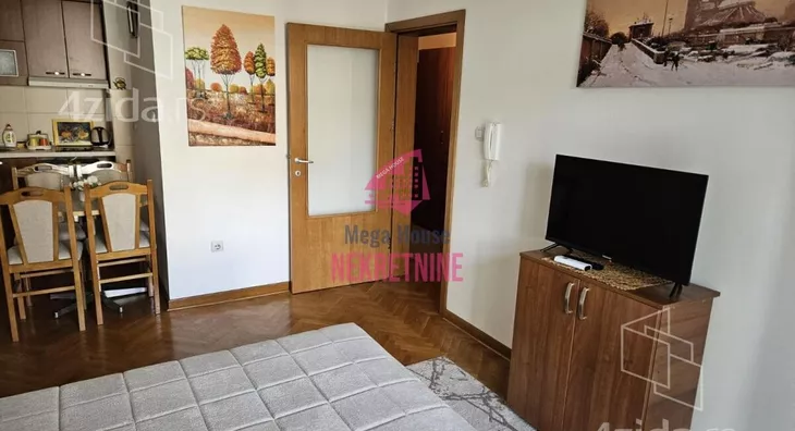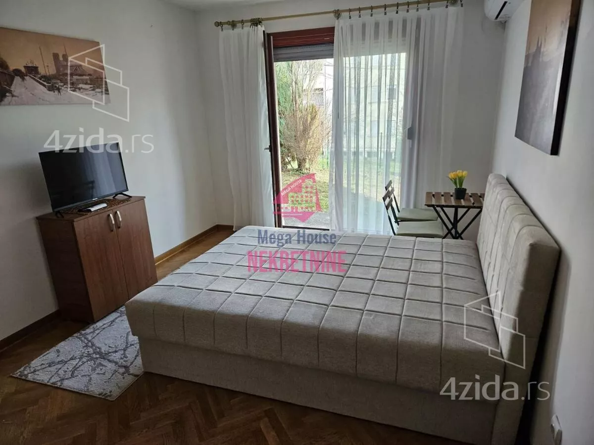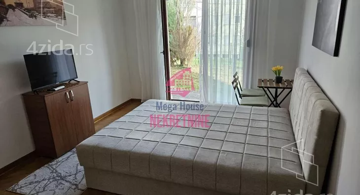 Garsonjera na 30m od parka na Snezniku, kompletno opremljena , na prizemlju stambene zgrade ,istocno orjentisana, ima lepu terasu koja izlazi na travnatu povrsinu pogled prema parku ,