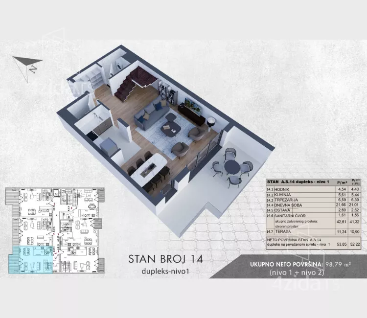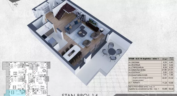 Nivo 1 - hodnik, kuhinja, trpezarija, dnevna soba (površine 22m2), ostava, kupatilo, terasa (površine 11m2).