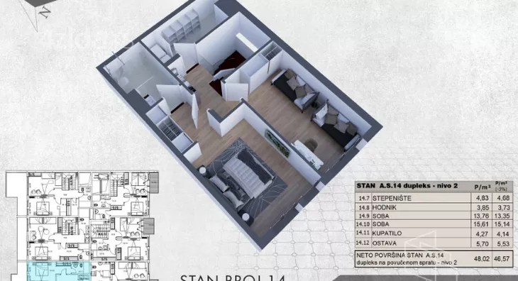 Nivo 2 - stepenište, hodnik, spavaća soba 1 (površine 14m2), spavaća soba 2 (površine 16m2), kupatilo, ostava (površine 6m2).