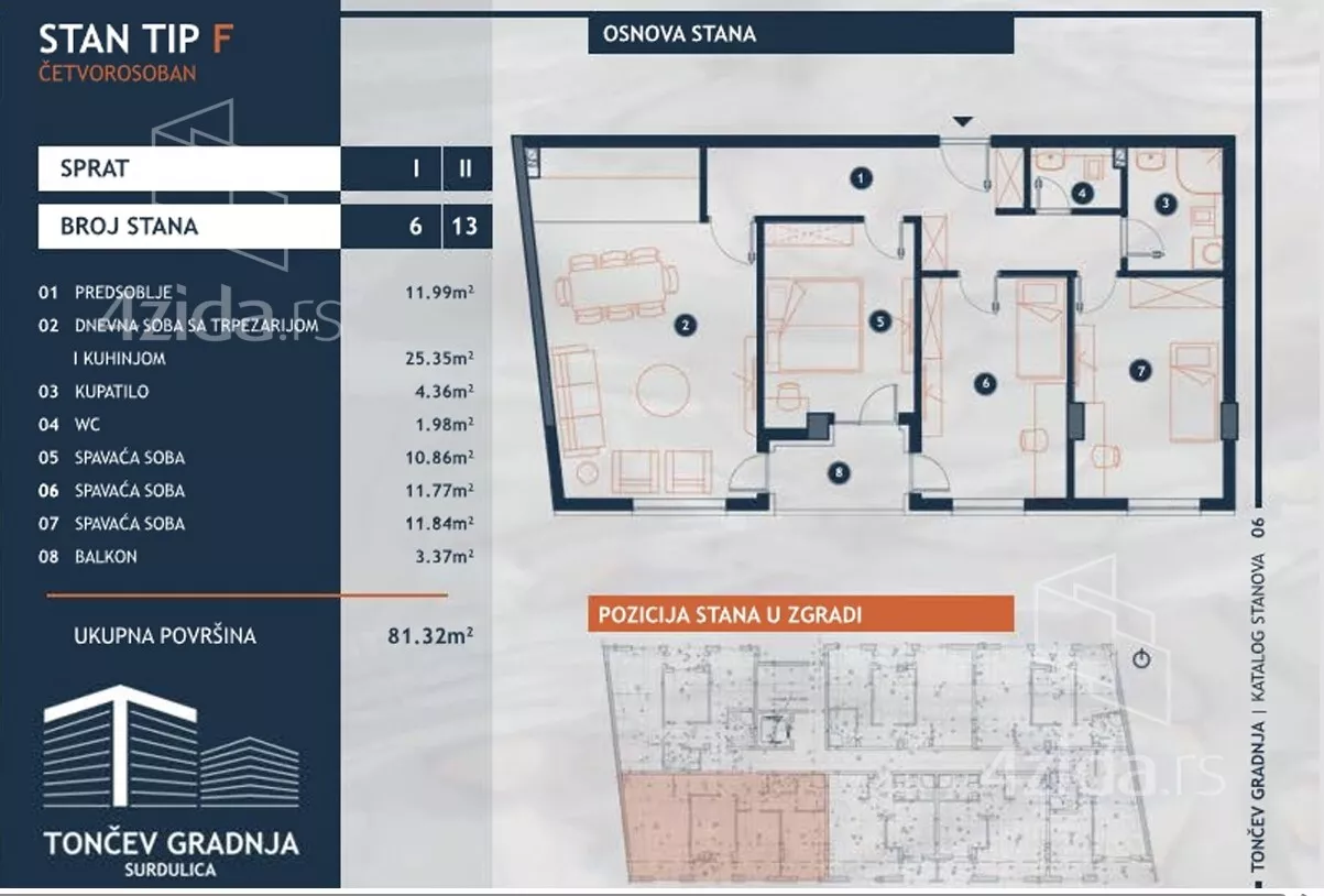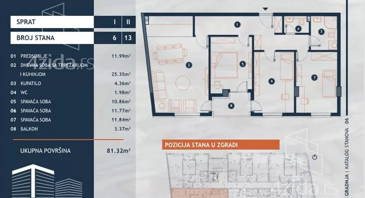 Stanovi ove kvadrature i rasporeda prostorija dostupni su na I, II, III i V spratu zgrade.