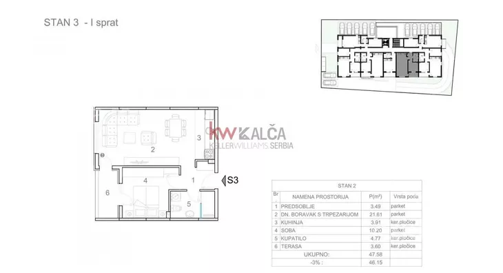 Stambeni objekat, spratnosti Po+P+6, gradi se na veoma traženoj lokaciji u naselju Pantelej, između Somborskog bulevara i hotela Zen, u neposrednoj blizini osnovne škole Čegar i Stefan Nemanja, okruženo velikim brojem prodavnica, apoteka, kafićima i ostalo. U blizini se nalazi i Pantalejska pijaca i autobuska stanica.Stan je dostupan na I,III,IV,V,VI spratu projektovane površine 46,15 m2 i sastoji se od dnevnog boravka sa trpezarijom i kuhinjom, spavaće sobe, kupatila i terase. Stanu pripada stanarska ostava u podrumu zgrade.
