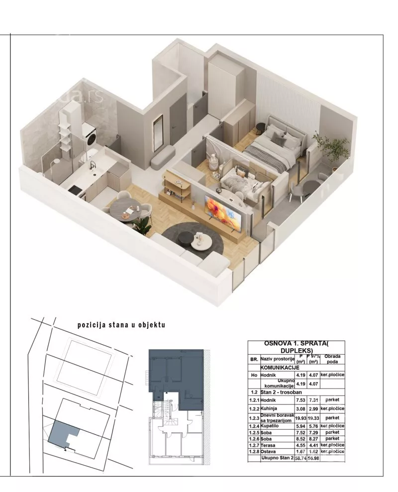 Novi Sad, Sremska Kamenica. LUKSUZNI STANOVI SA POGLEDOM NA NOVI SAD I FRUŠKU GORU! GARAŽNO MESTO + PARKING MESTO ISPRED ZGRADE + OSTAVA! Stanovi su u izgradnji - završni rok februar 2026.godine. U pitanju je vila od 6 stanova različitih struktura - trosobni, četvorosobni i petosobni penthaus. Stan je površine 61m2, a drugom spratu - iznad duplex; po strukturi je trosoban, sastoji se iz dnevnog boravka sa staklenim portalima od poda do plafona sa pogledom na Novi Sad, dve spavaće sobe koje imaju izlaz terasu od oko 7m2, kuhinje, velikog kupatila, ostave u stanu , a u cenu ulazi i GARAŽNO MESTO + ostava u sklopu zgrade, PARKING MESTO ispred zgrade. Stan je komotan, svetao, plafoni su visine 3m, GREJANJE PODNO PO UTROŠKU.