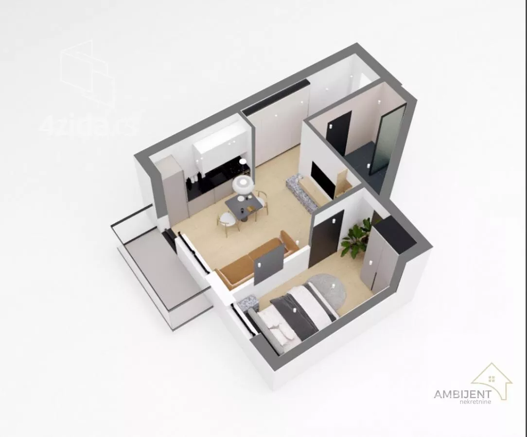 Stan ima 35m2, nalazi se na trećem spratu i poseduje dnevnu sobu sa kuhinjom, spavaću sobu, kupatilo i terasu.